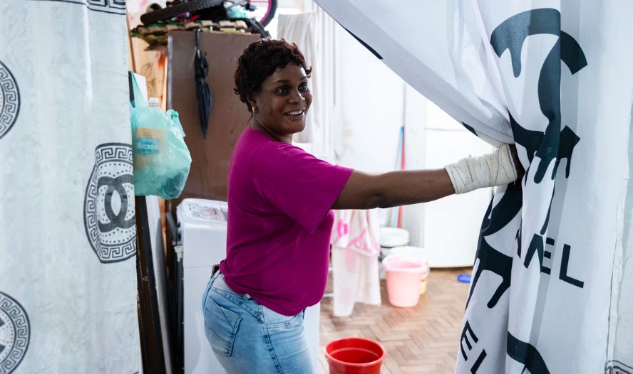 A refugiada Elisa José, 42 anos, que vive há quase dez anos no Brasil com três filhos, é uma das moradoras do prédio. Nem todos os apartamentos possuem banheiro, e as pessoas precisam dividir os lavabos adaptados com chuveiro no corredor. Por ser uma das moradoras antigas — ela está no Granjal desde 2022 — conseguiu fazer um puxadinho, anexando o banheiro ao dormitório.